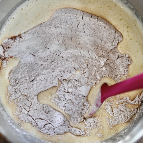6. Using a spatula fold dry ingredients into egg mixture