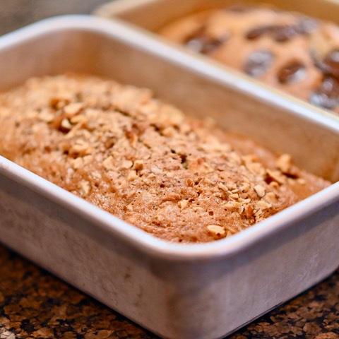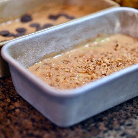 7. Stir 3/4 chopped walnuts and/or 3/4 chocolate chips into batter and pour into prepared pans OR Divide batter between two pans and stir nuts into one and chocolate into the other